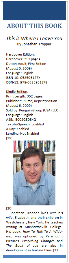 They will have to use up the entire estate before they qualify for aid. Jonathan Tropper is the internationally bestselling author of six novels:. Plan B, The Book of Joe, Everything Changes, How To Talk to a Widower, This Is Where I Leave You, and One Last Thing Before I Go.