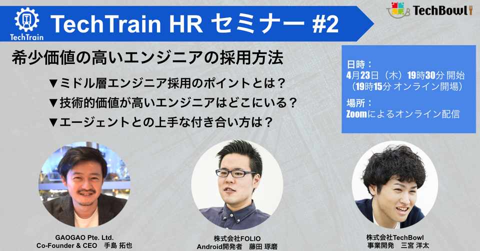 イベント告知 4 23開催 Techtrain Hrセミナー 2 希少価値の高いエンジニアの採用方法 Techbowl Note