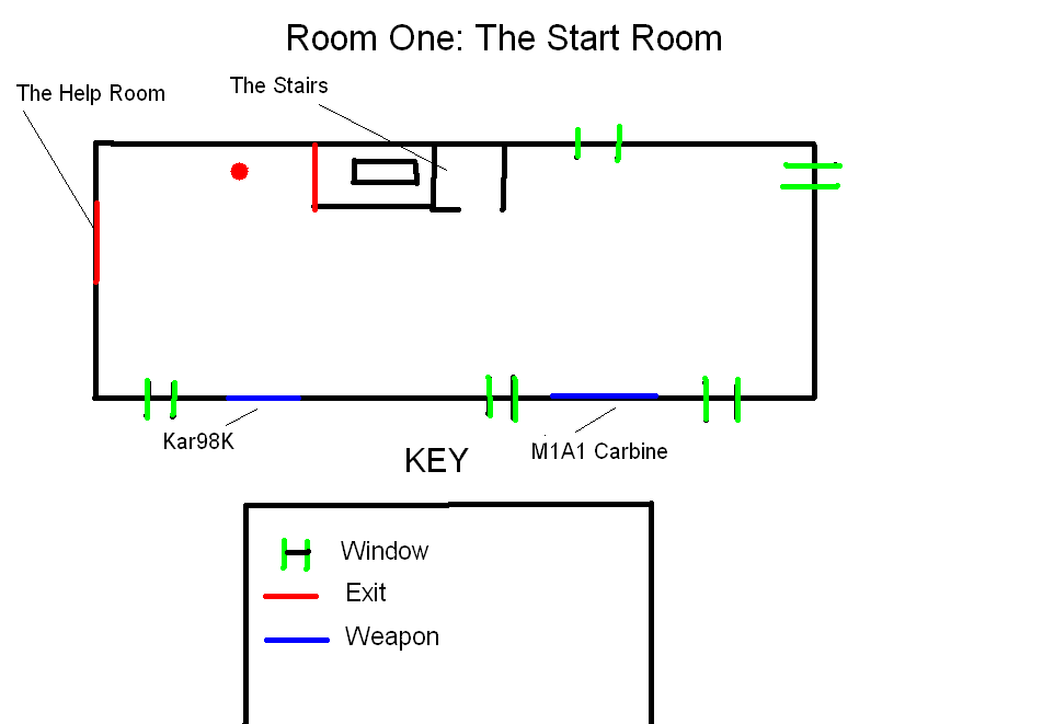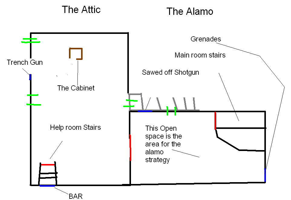 The "Help" Room is blocked by debris and the stairs have collapsed, making it only possible to stay in the starting room. They stand by the stairs which are still blocked and will get all the zombies from the upstairs windows and the smaller room downstairs. From the Upstairs Room, players can clear the debris blocking the path to the Help Room or return to the Spawn Room by clear the debris blocking the stairs.