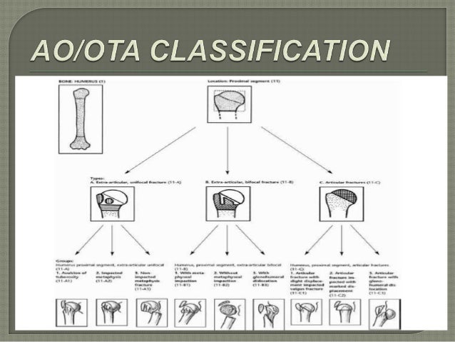 The Müller AO Classification of fractures is a system for classifying bone fractures initially published in 1987 by the AO Foundation as a method of categorizing injuries according to therognosis of the patient's anatomical and functional outcome. Books on AO/OTA Classification of Distal Humeral Fractures. Proximal humerus fracture rates will continue to increase with the aging population 5-7,58 and the concomitant rise in osteoporosis.