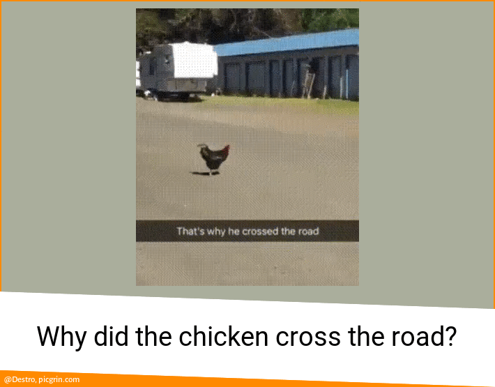 Chicken cross the road gif. Why did the chicken cross the road?. Check him out here:. 17,303 views, 25 upvotes, 16 comments.