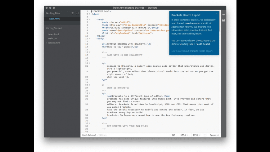 Mac版はdmg形式、Windows版はmsi形式、Linux版はDebianパッケージが公式サイトからダウンロードできます。 インストールして最初に起動すると、「index.html (Getting Started)」が表示されます。これはBracketsのガイドページのHTMLファイルです。.
